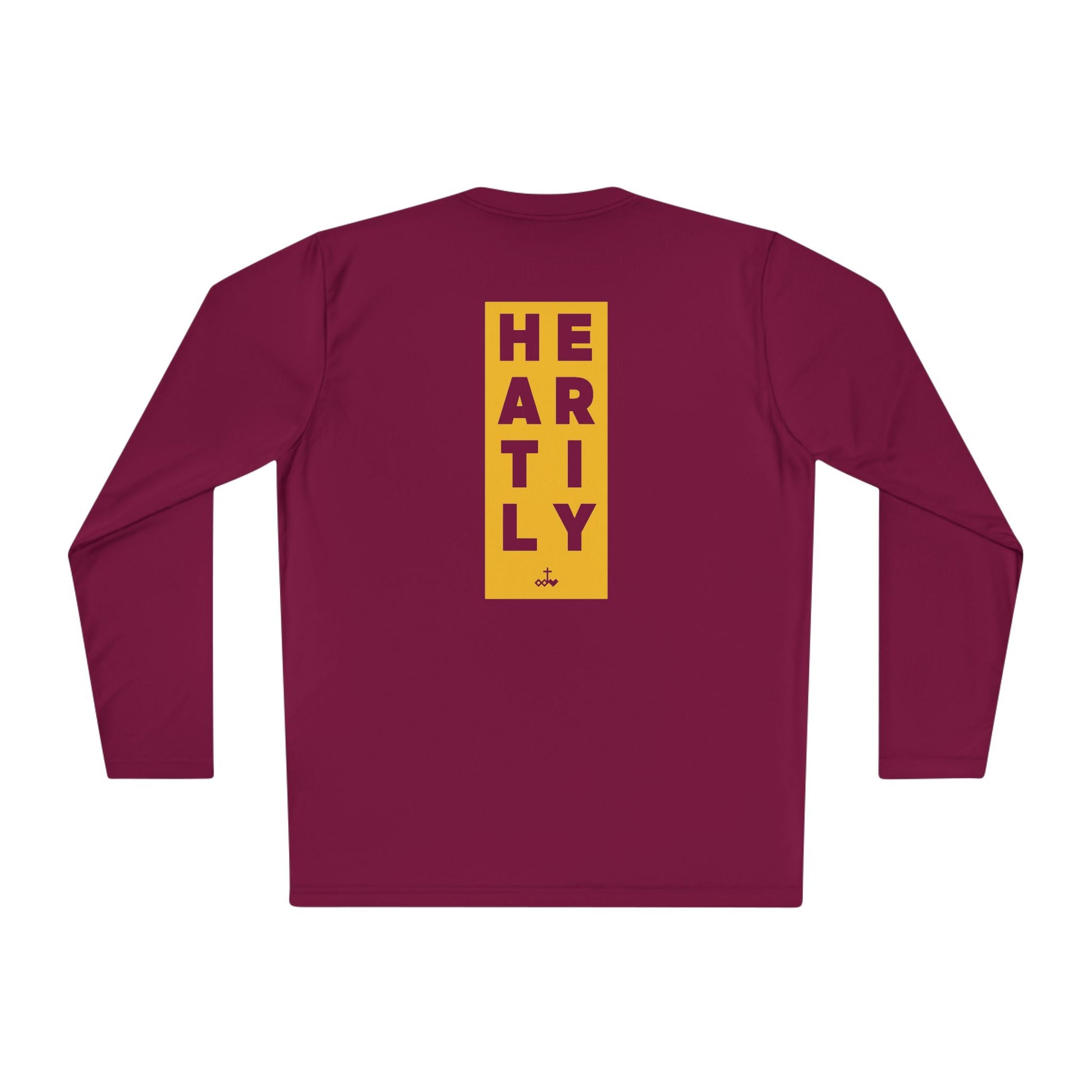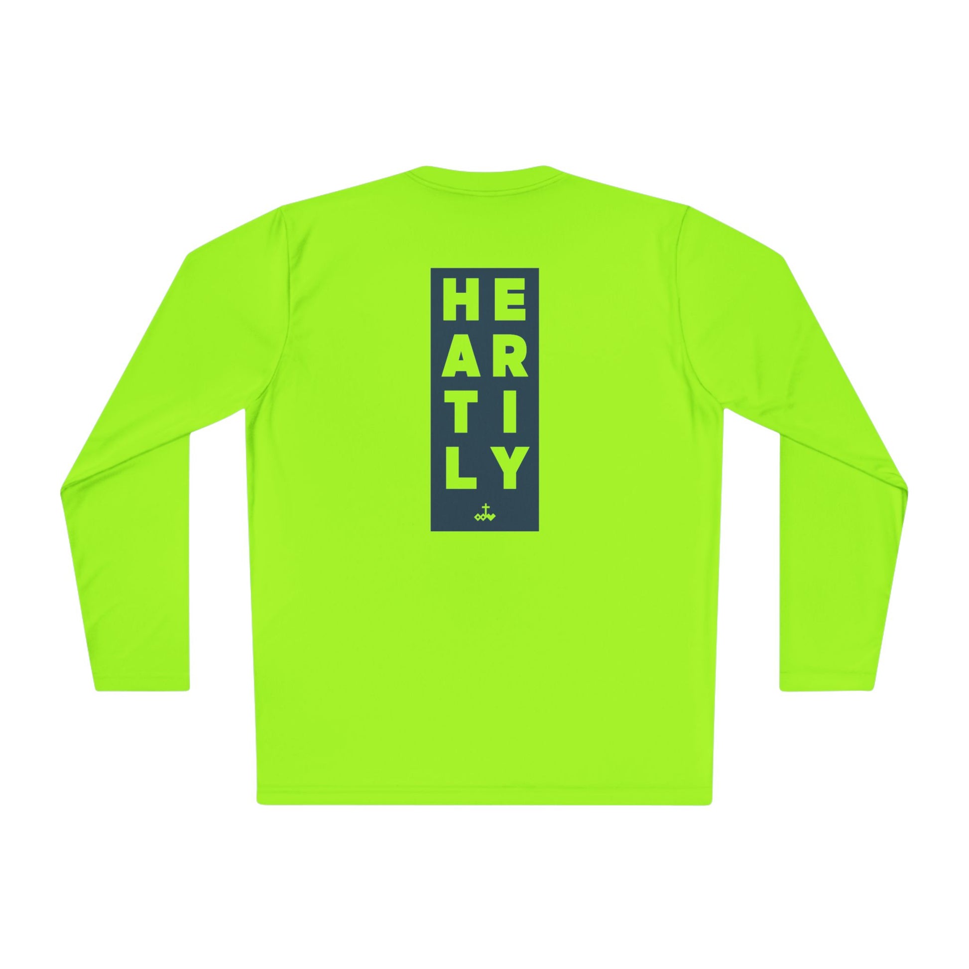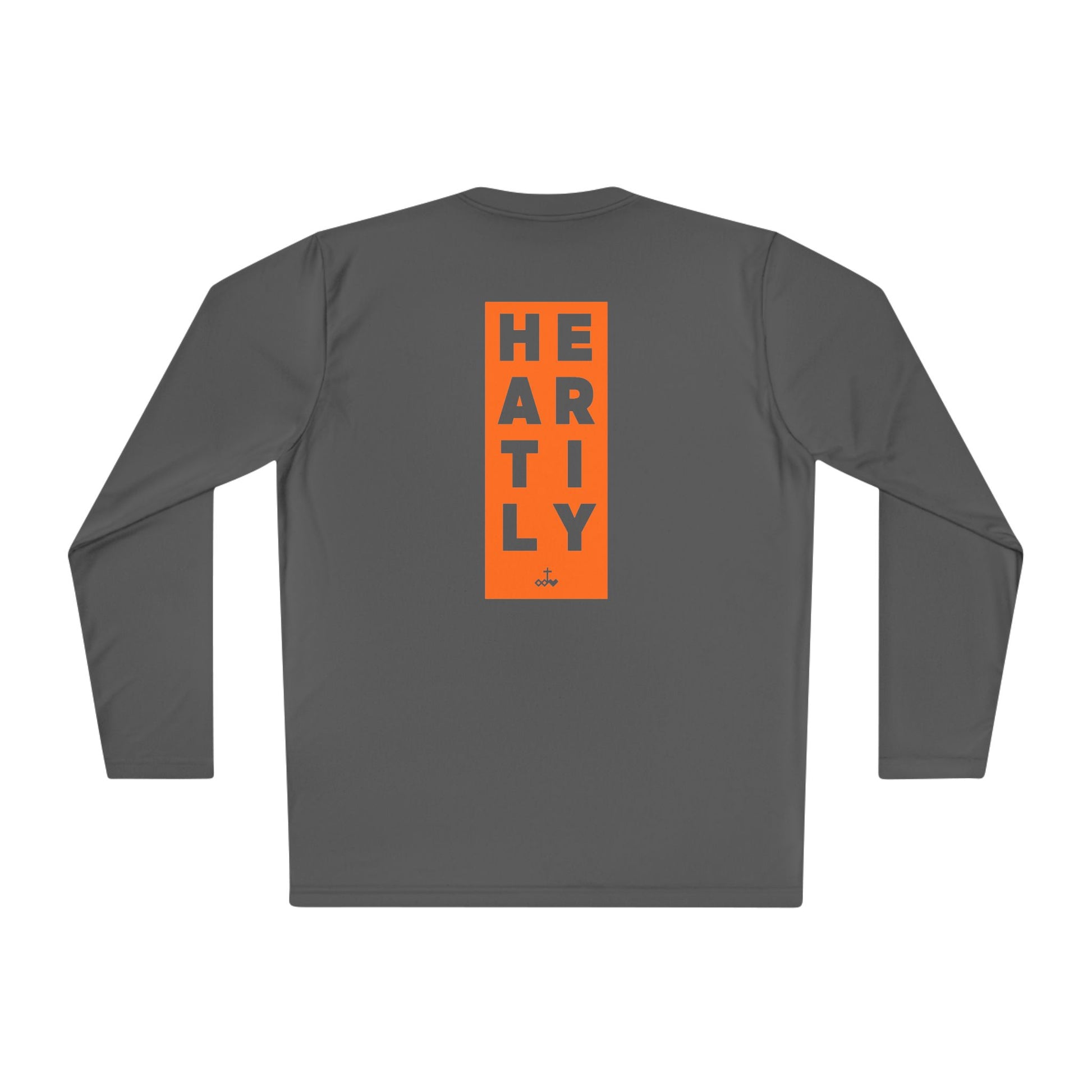 Lightweight long-sleeve built for movement and everyday momentum. The slim athletic cut and breathable 100% polyester keep you cool through runs, training sessions, or layered city days. Clean, minimalist text details — a small front block reading “WHATEVER YOU DO” and a taller vertical back panel spelling “HEARTLY” — give the tee a quiet, confident look that reads sporty and intentional. Wear it after a sunrise run, under a jacket between meetings, or as your go-to for active weekends. The fast-drying fabric and tear-away label make it comfortable for repeated wear and easy care.