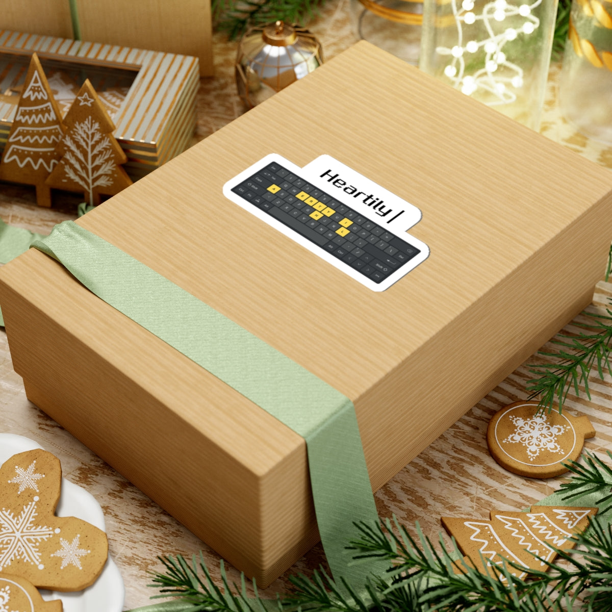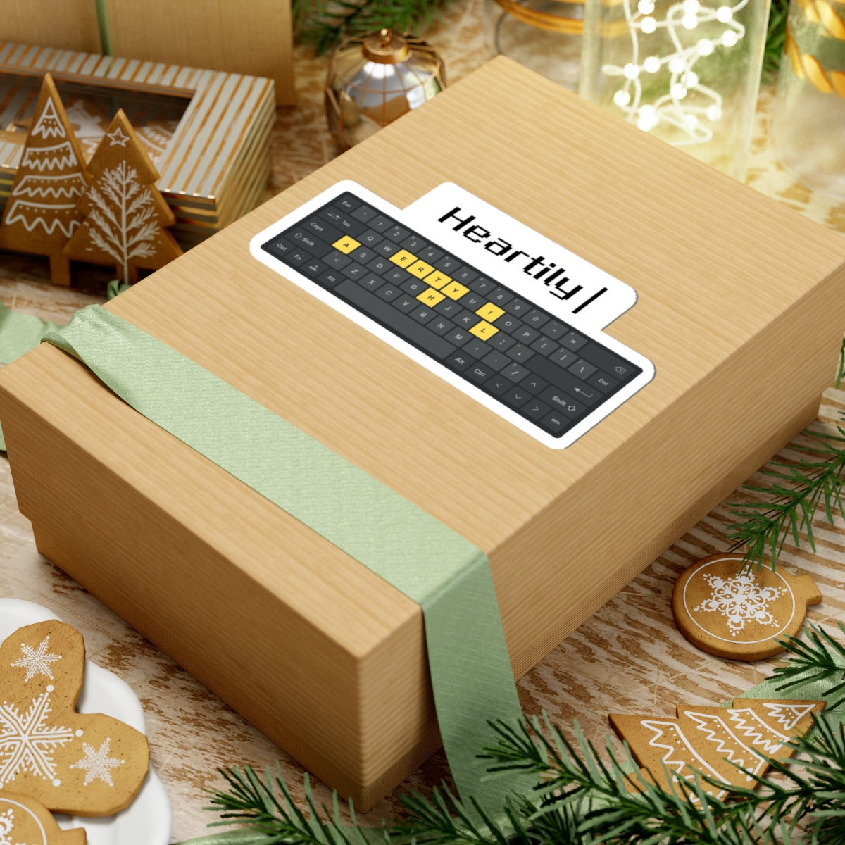 A compact, glossy kiss-cut sticker featuring a minimalist keyboard graphic and the word “Heartily” — made to stick to laptops, journals, phone cases, and other smooth surfaces. The design highlights a row of yellow-highlighted keys against a dark keyboard silhouette for a subtle pop of color without shouting. It’s lightweight, quick to apply, and built from durable vinyl with permanent adhesive so the artwork stays put during daily use. Choose white or transparent backing and from four sizes to match your device or notebook. This sticker adds a quiet, tech-savvy accent to your space and feels right at home on the desk of someone who types, creates, or codes with thoughtful intent.